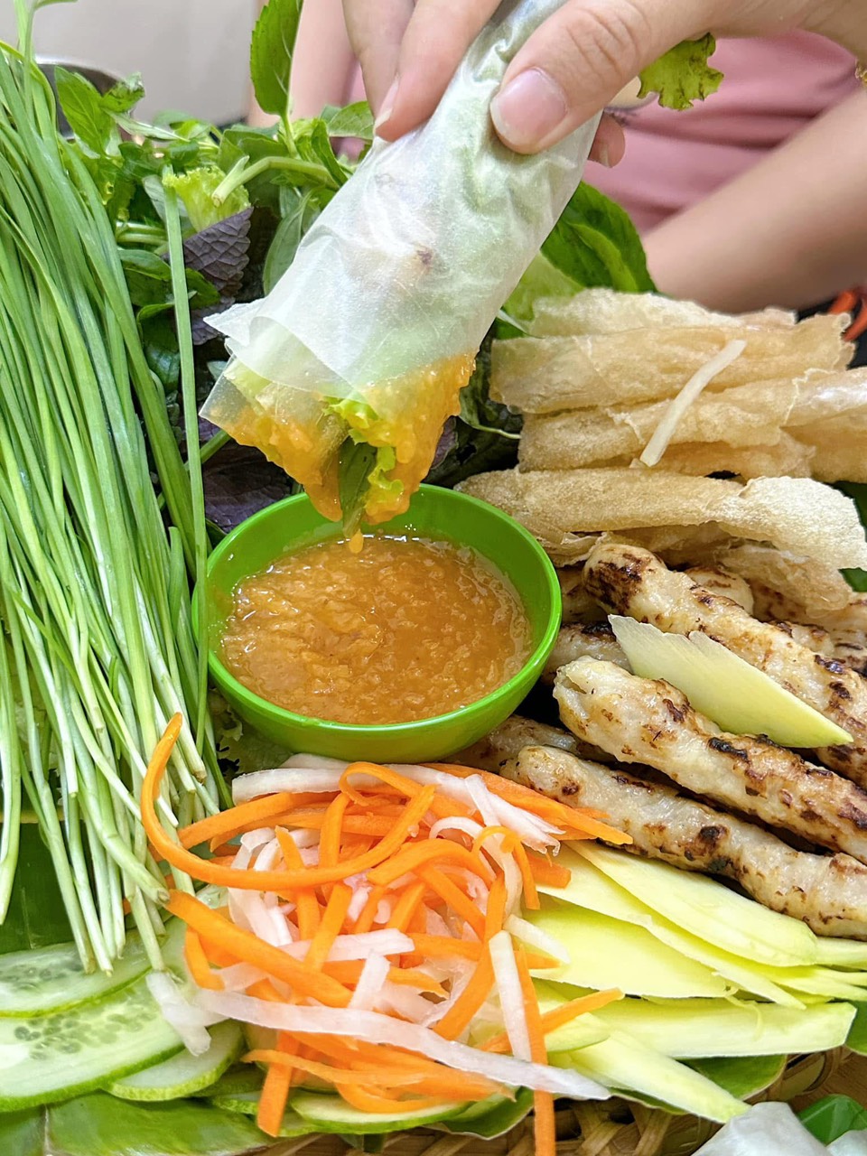 – Món ăn trứ danh với nem nướng thơm lừng, cuốn bánh tráng kèm rau sống, chấm với nước sốt đậu phộng béo ngậy.